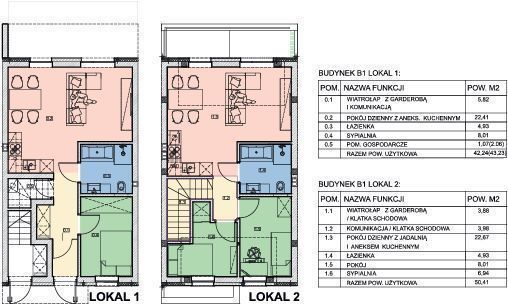 Prezentowany dom jest segmentem zewnętrznym,o numerze projektowym B1, Lokal na piętrze, oznaczony jako B1/2, posiada powierzchnię 50,41 mkw.Lokal na parterze posiada powierzchnię 42,24 mkw.